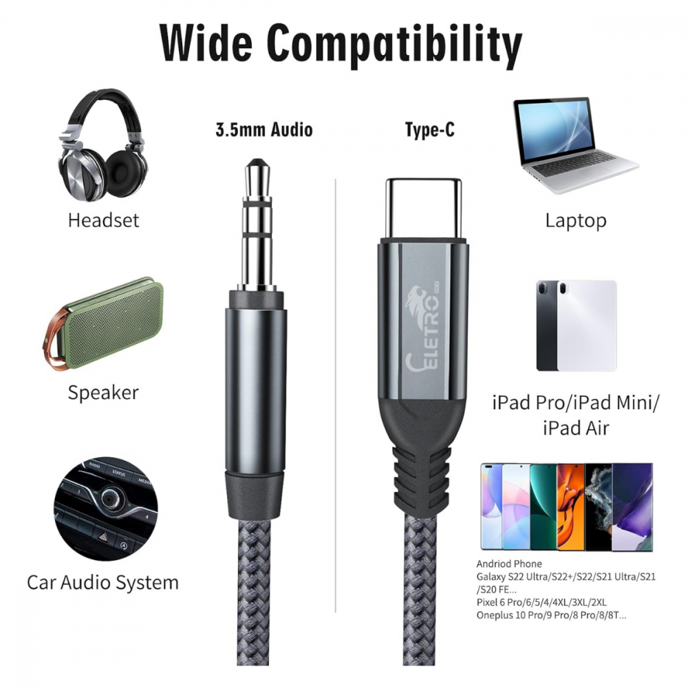 Compatível com a maioria dos telefones com conexões de fone de ouvido tipo C e/ou 3,5 mm. Você pode usá-lo para transmitir música para o seu estéreo de carro, estéreo doméstico, alto-falante ativo, fones de ouvido ou qualquer dispositivo com entrada de áudio padrão de 3,5 mm ou porta auxiliar.