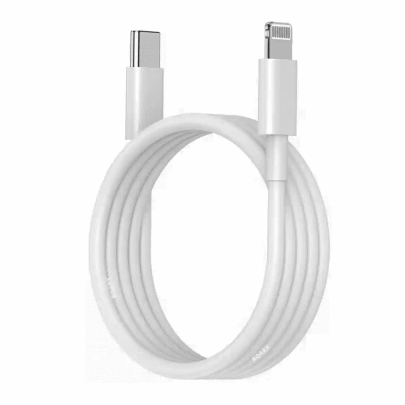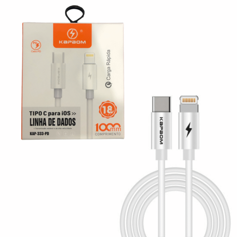 O Cabo de 30W possui capacidade de carregamento e transferência de dados de alta velocidade. Com conectores USB TIPO-C e Lightning nas extremidades.