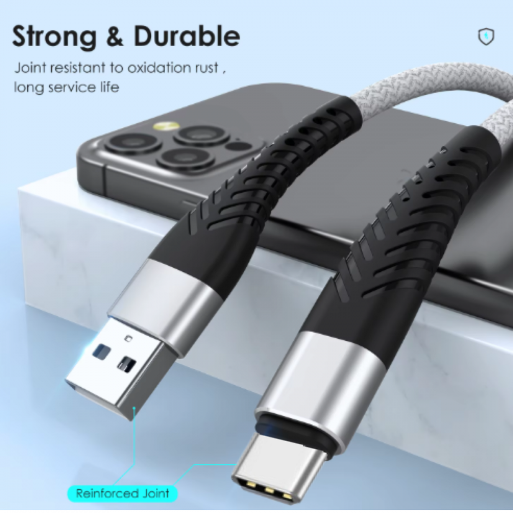 O revestimento de nylon de alta qualidade protege o cabo contra desgaste, dobras e quebras. Sinta-se confiante de que este cabo está construído para durar.