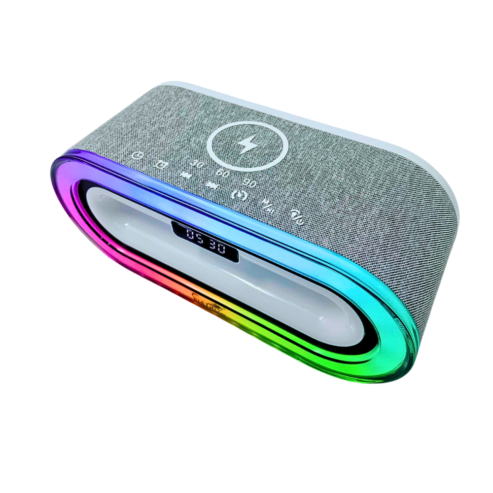 Caixa De Som com Relógio Digital Luz LED RGB e Carregador Por Indução 50W