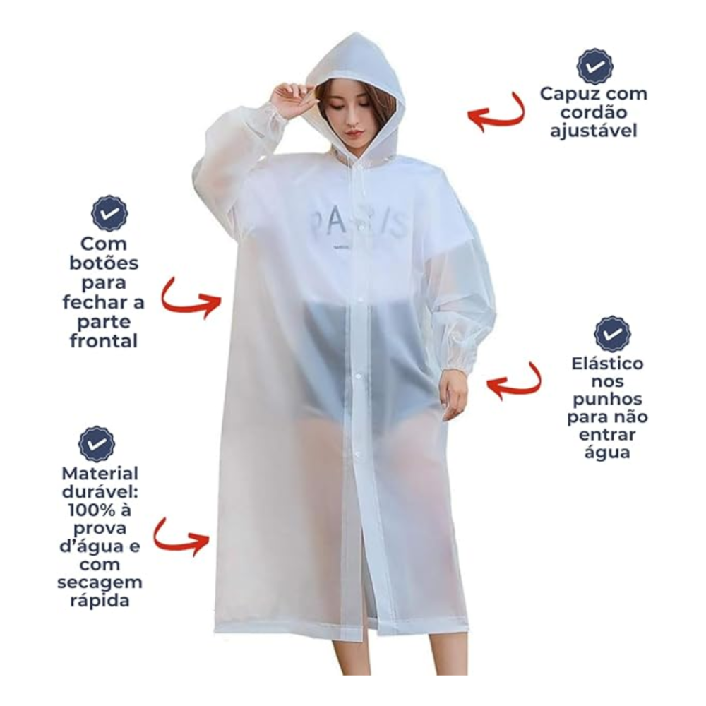 -Com Capuz: Possui um capuz integrado para proteger a cabeça e o pescoço da chuva, um elemento essencial para uma proteção completa.