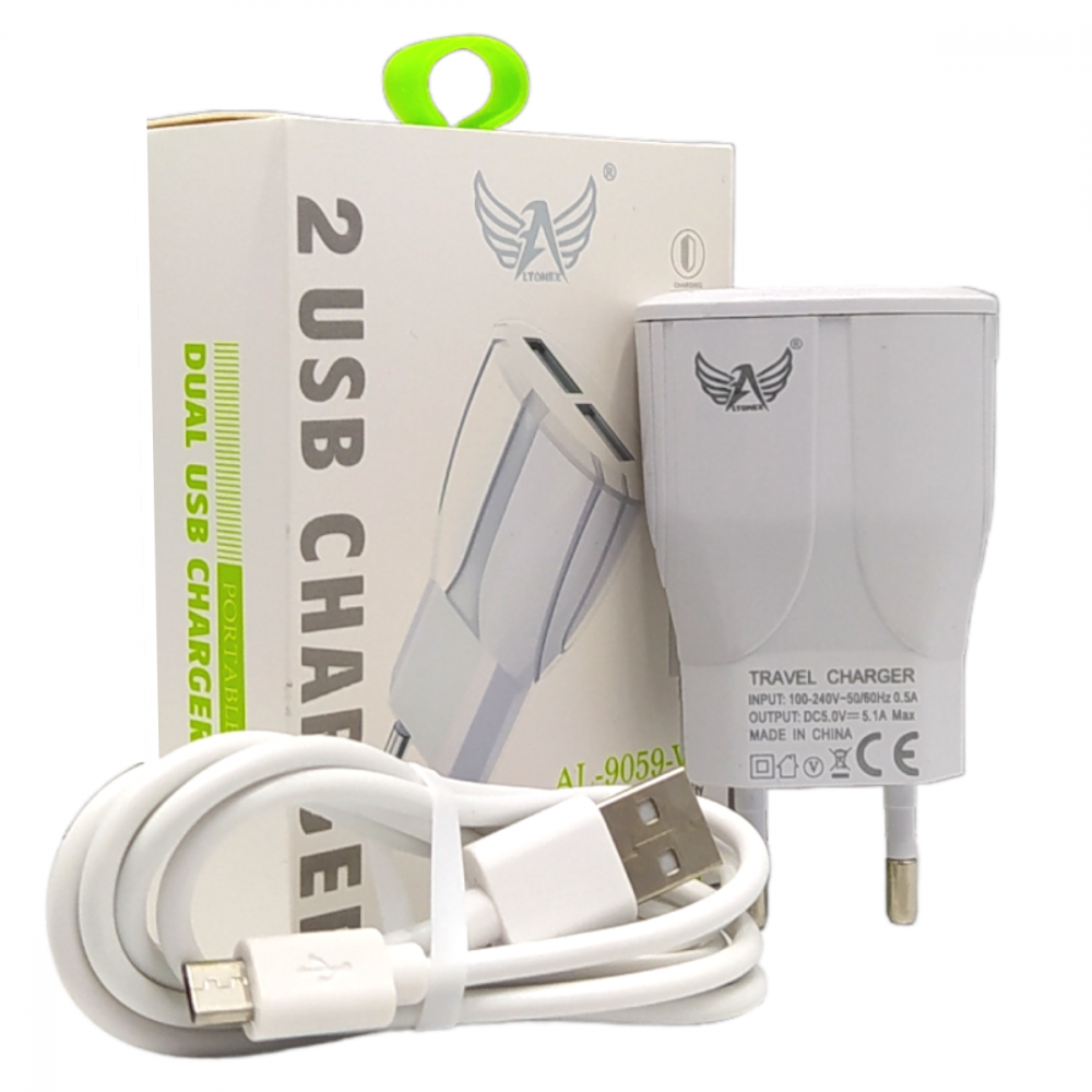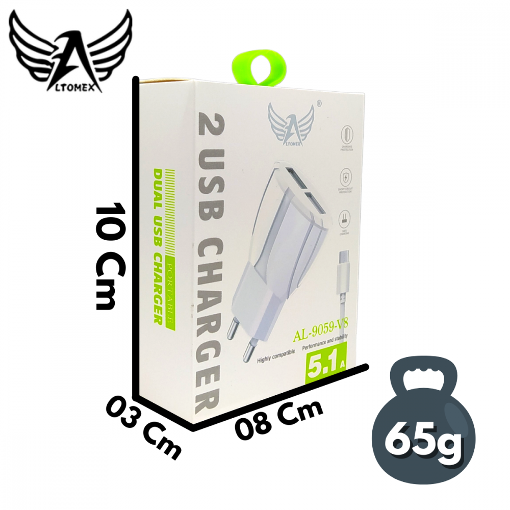 Carregador Completo TIPO-C 5.1A com 02 Portas USB Cabo Móvel 1 metro Altomex AL-9301-TY