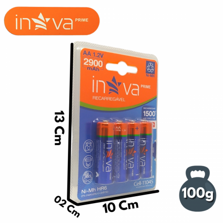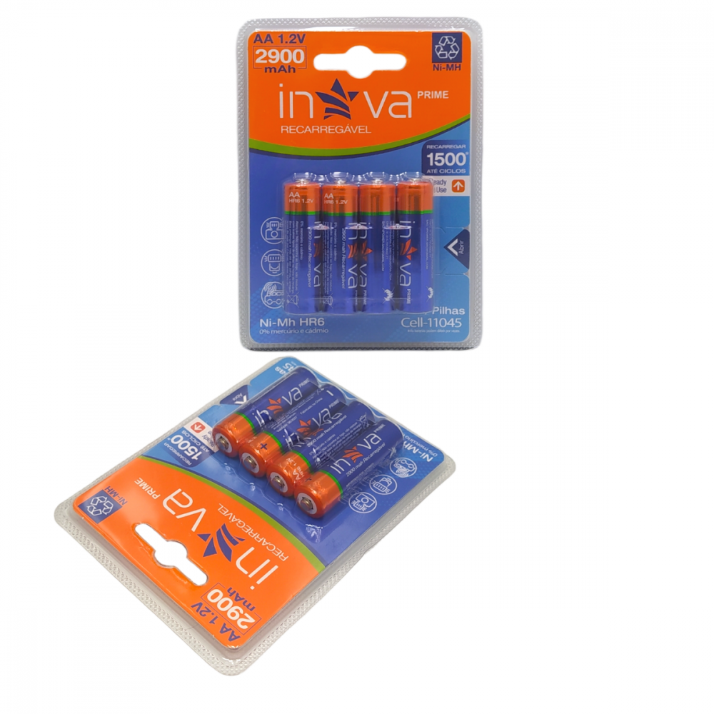 Em até 1x de R$13.99 sem juros Cartela com 04 Pilhas recarregáveis AA – Inova Prime – 1.2V – Cell-11045 / 12078-AA