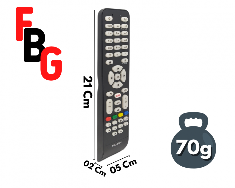 O Controle Remoto Compatível com Smart TV AOC com Tecla Netflix FBG-8050 é um controle remoto projetado para funcionar com diversos modelos de Smart TVs LCD e LED da AOC que possuem um botão dedicado para acesso direto ao aplicativo Netflix.