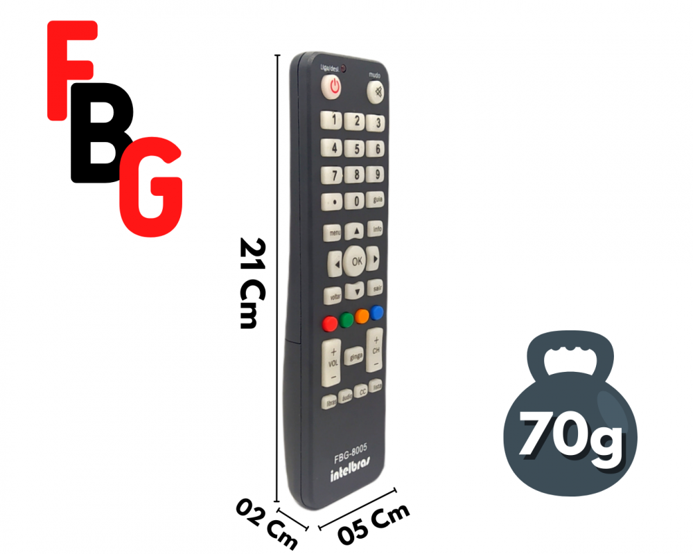 O Controle Remoto Compatível com Conversor Digital Intelbras FBG-8005 é um controle remoto projetado para funcionar com diversos modelos de conversores digitais da marca Intelbras.
