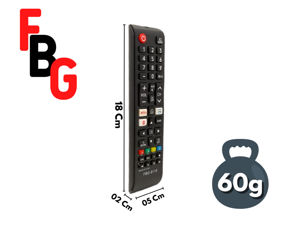 O Controle Remoto Compatível com TV Samsung Smart LCD e LED com botão Netflix, YouTube e Prime Video FBG-9110 é um controle remoto genérico/paralelo projetado para funcionar com diversos modelos de Smart TVs LCD e LED da Samsung que possuem a função Smart Hub e botões dedicados para acesso direto aos aplicativos Netflix, YouTube e Amazon Prime Video.
