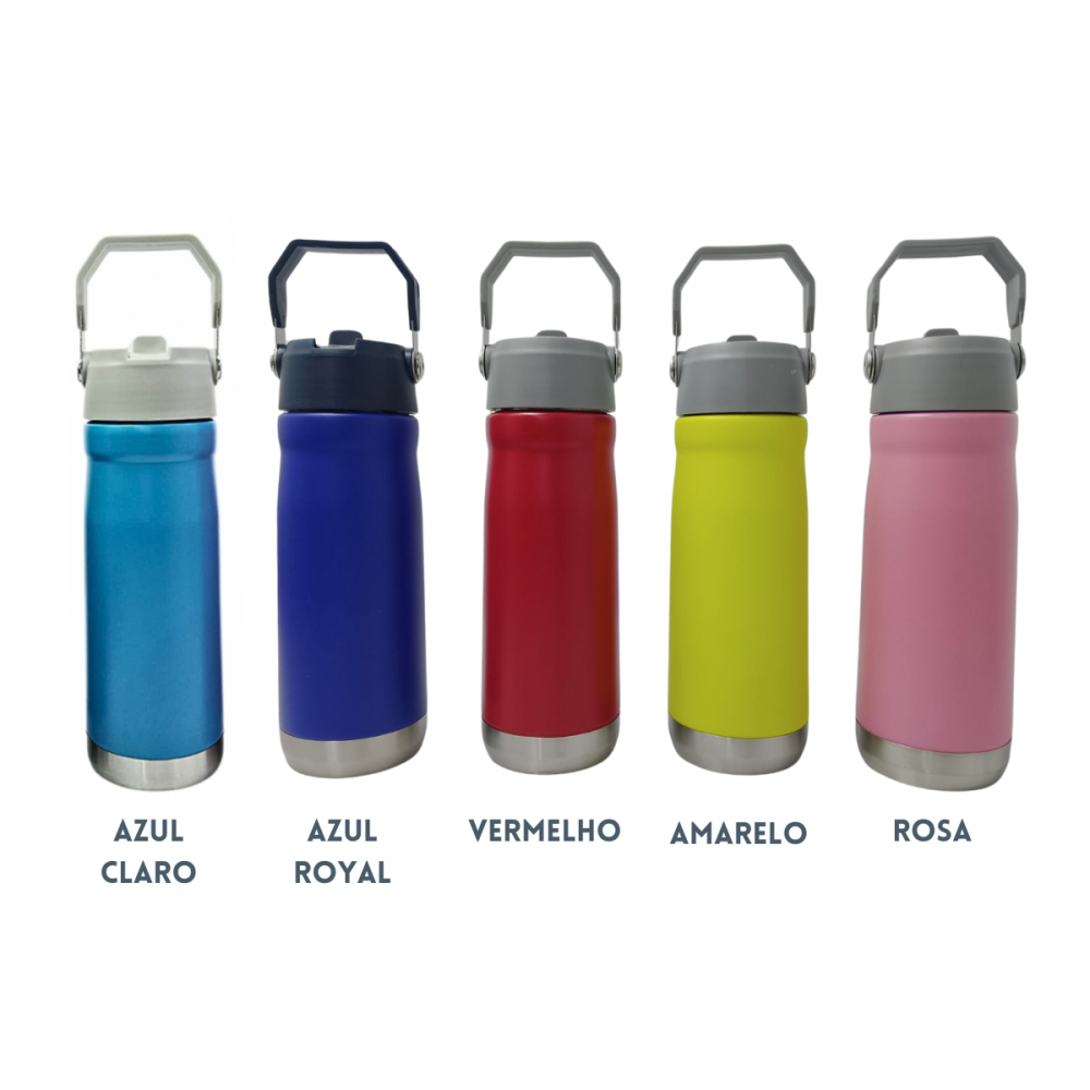 Aço Inoxidável 18/18. Isolamento a vácuo, sem condensação. Resistente à corrosão e oxidação. Livre de BPA. Abertura Hermética, parede dupla.