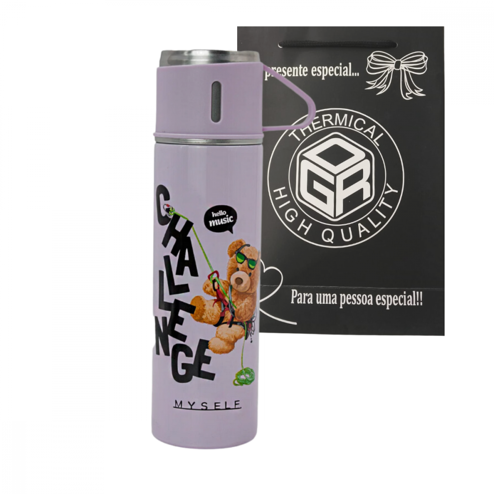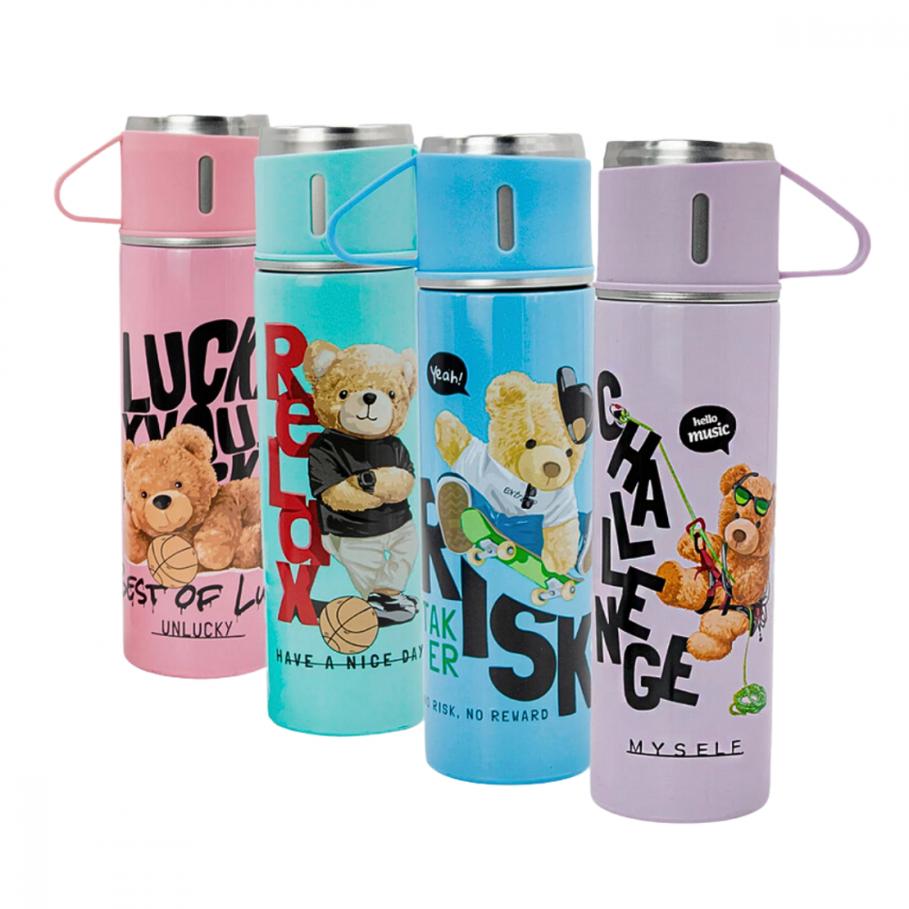 Garrafa Térmica Inox 500ml com 3 Xícaras Estampa Urso GDR1015