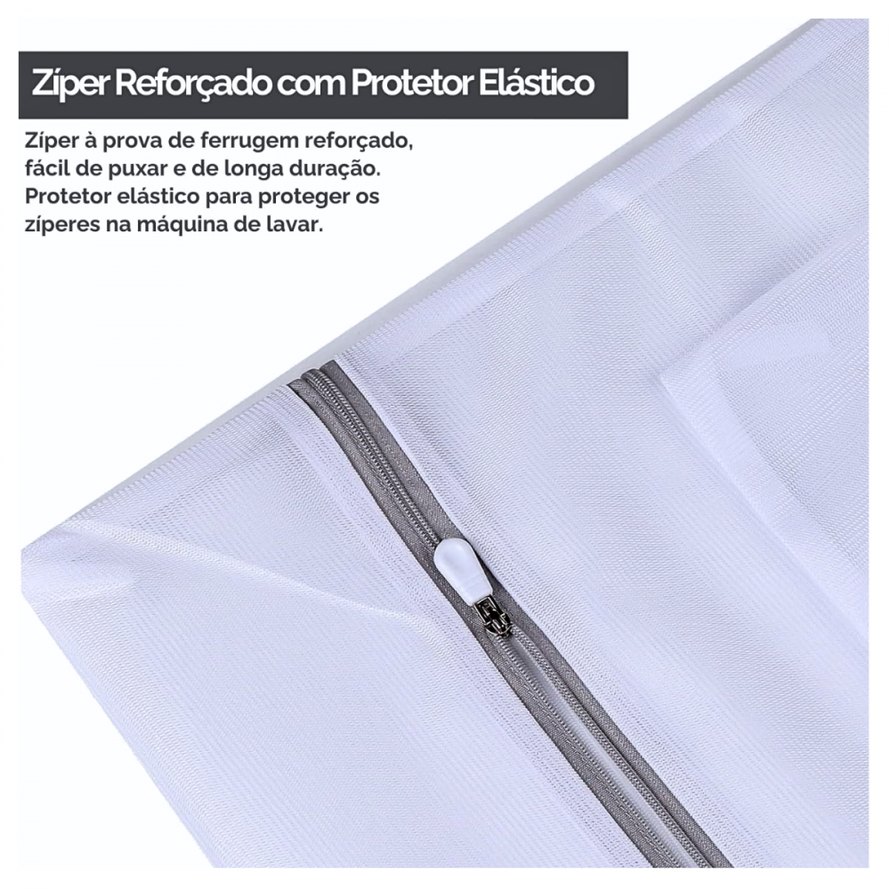 Os sacos possuem zíper com protetor para evitar a abertura durante o uso e são compatíveis com máquinas de lavar e tanquinhos.