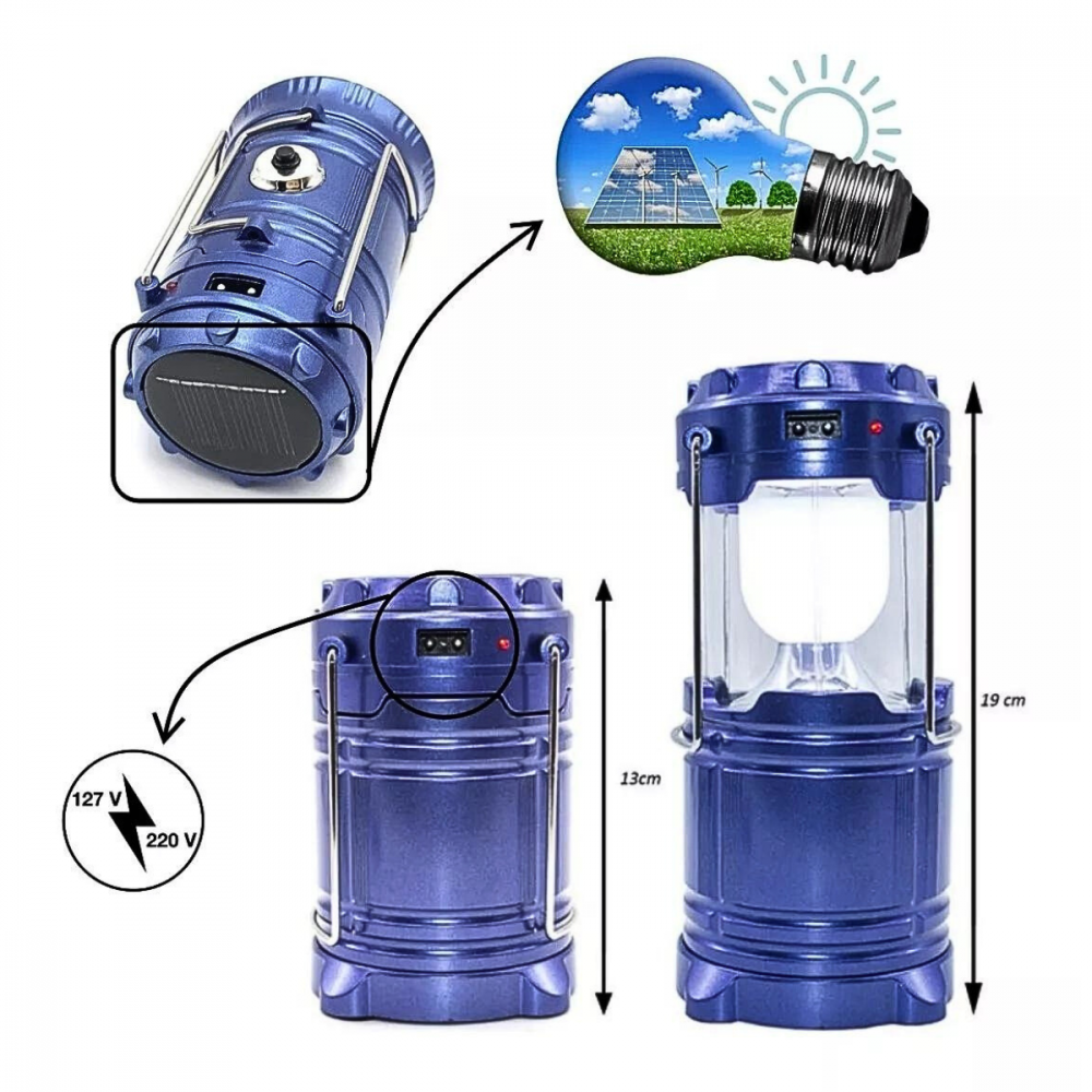 A Lanterna Lampião Solar Portátil Led com Alça é essencial para suas aventuras tendo um sistema multifuncional de carregamento, sendo solar ou da forma convencional via cabo de força tipo oitinho, tornando-o assim um aparelho com sistema de fácil carregamento