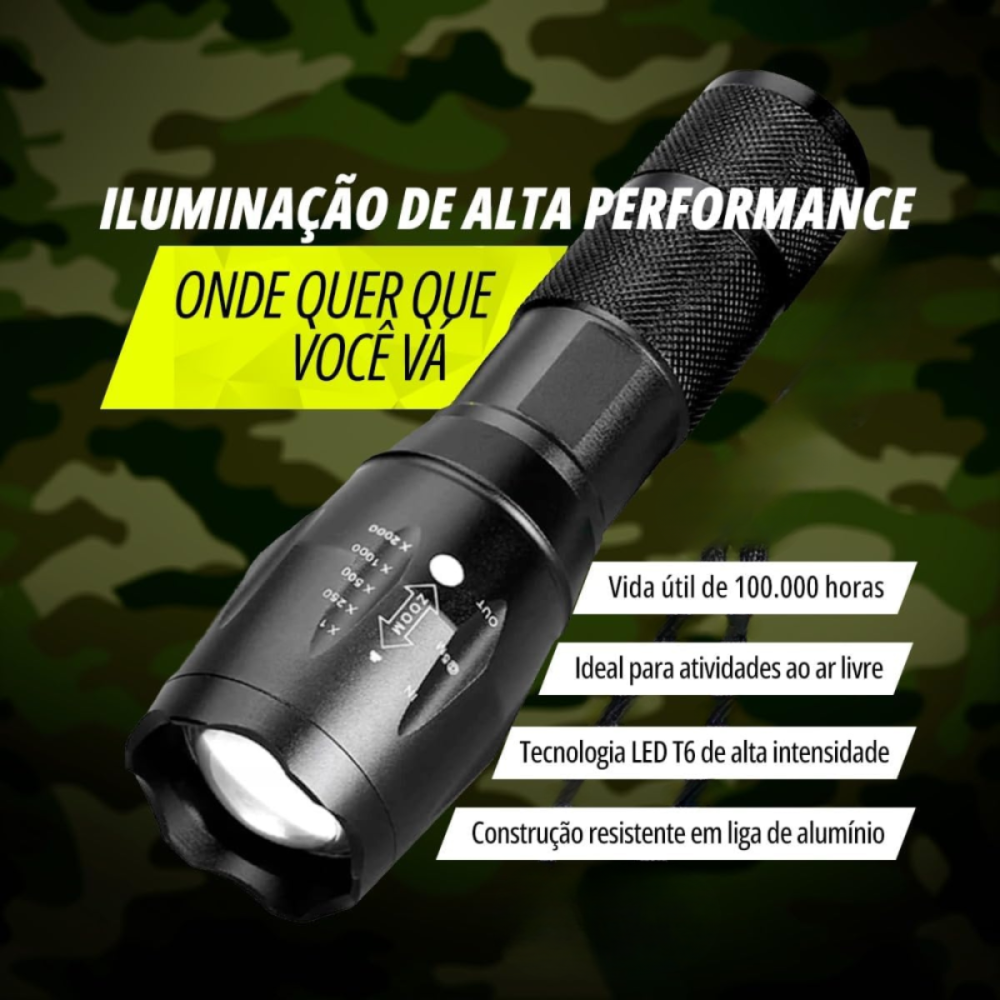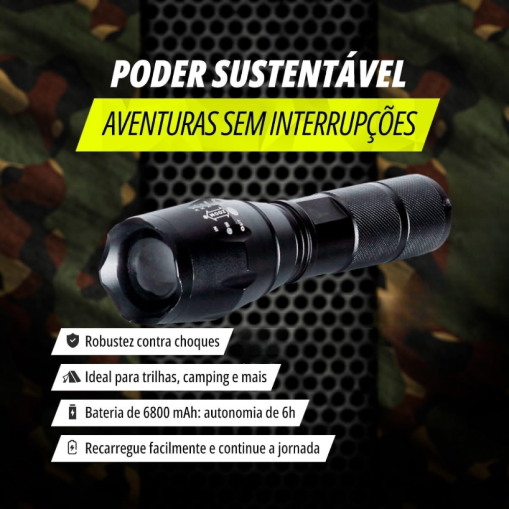 -Zoom Telescópico Ajustável: Permite ajustar o foco da luz, alternando entre um feixe amplo para iluminar grandes áreas e um feixe concentrado para alcançar objetos distantes.