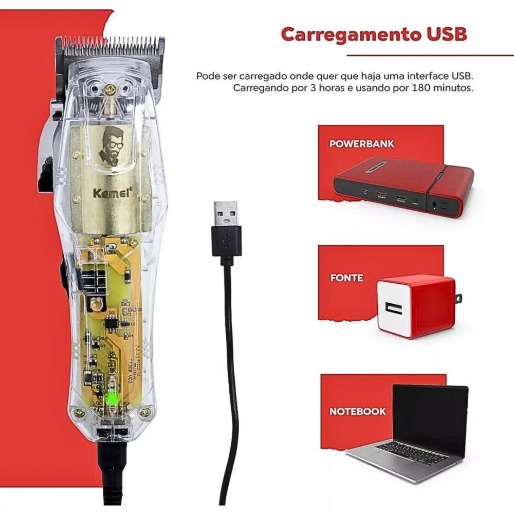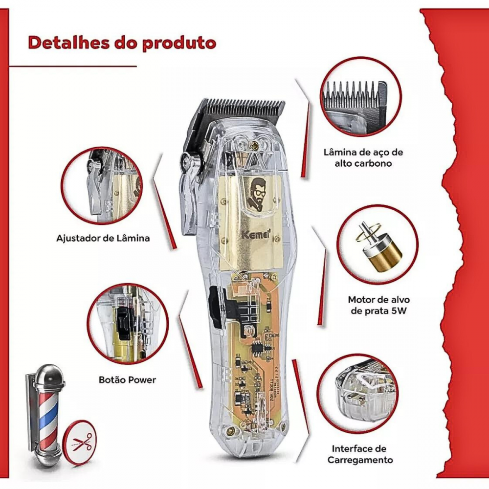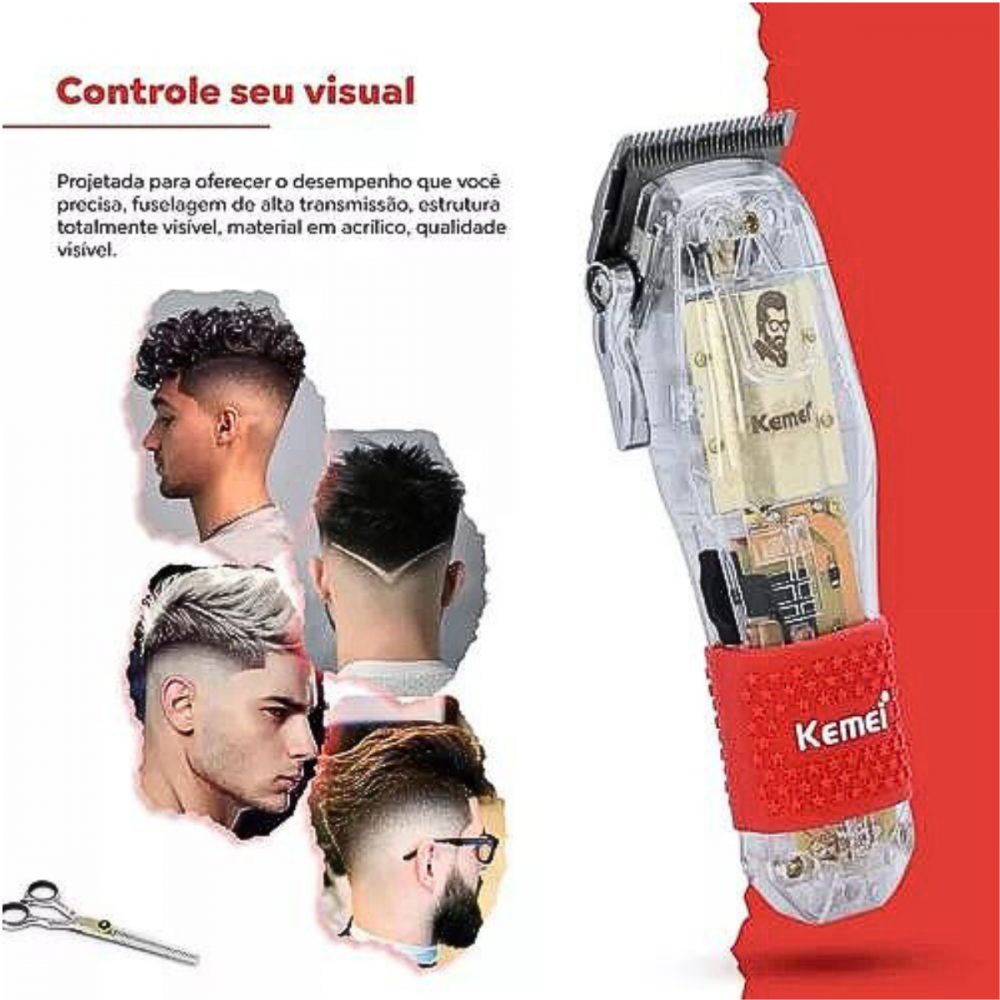 Máquina De Cortar Cabelo Profissional Sem Fio Transparente Kemei Ng203