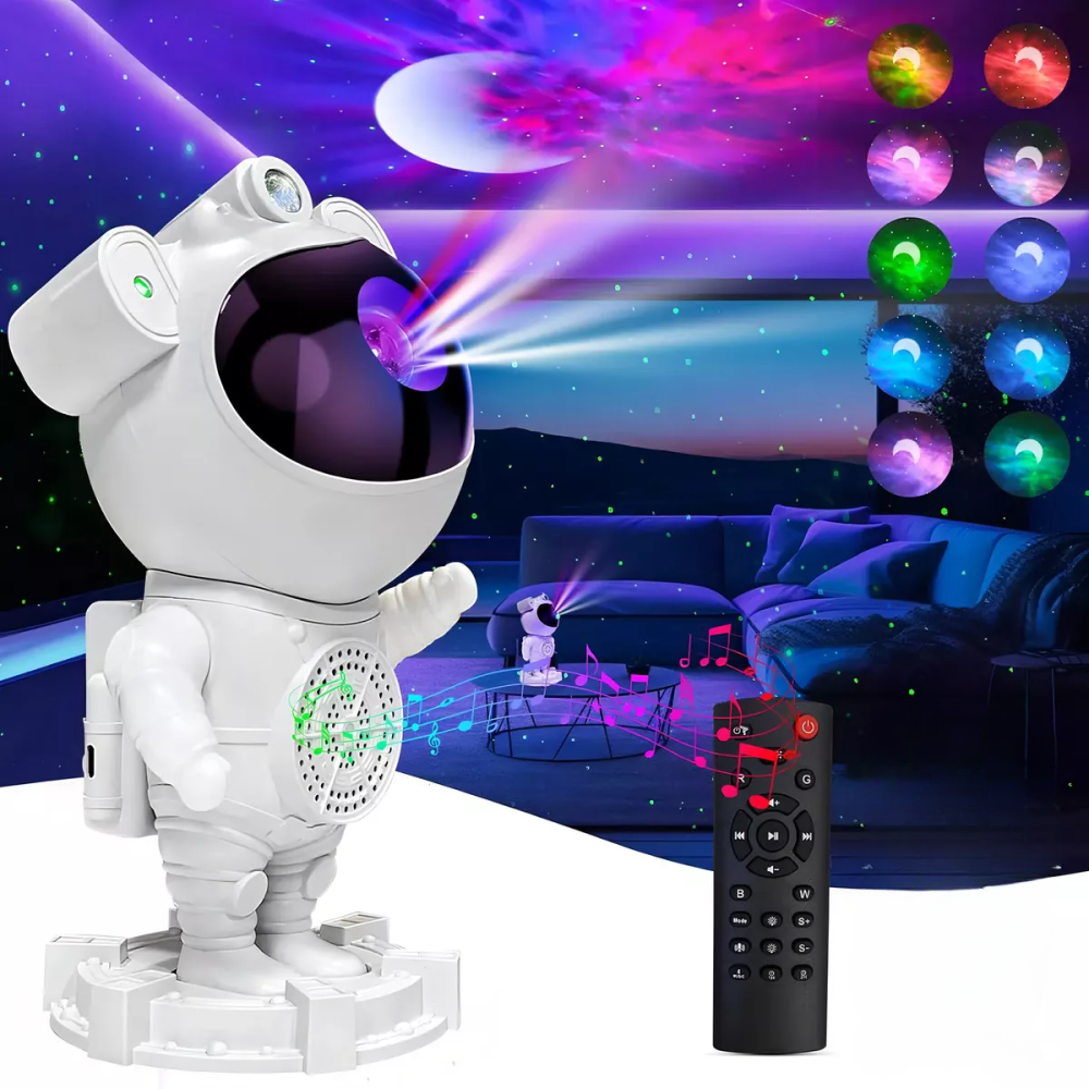 O Projetor Astronauta EL-1951 é um dispositivo multifuncional que combina uma cativante projeção de galáxias e estrelas com uma caixa de som Bluetooth integrada, tudo em um design adorável de astronauta. Perfeito para criar ambientes relaxantes, festivos ou como uma luz noturna única e divertida.