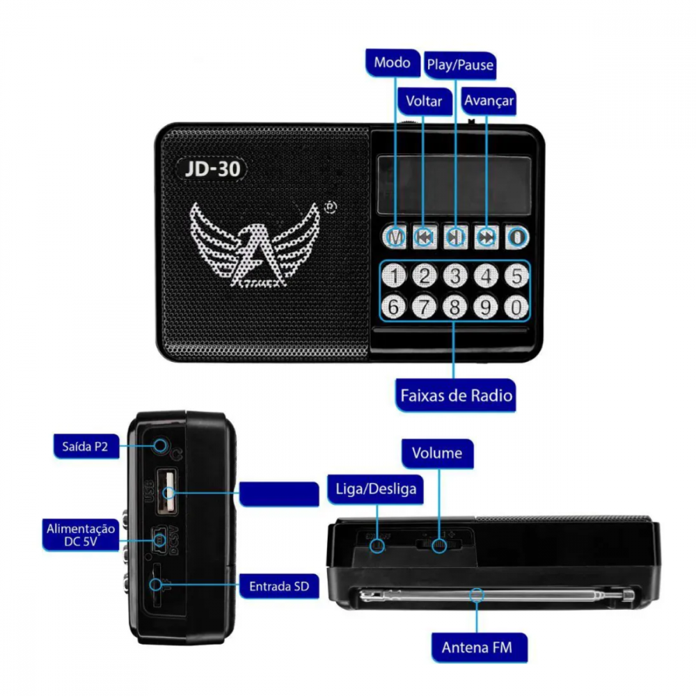 Rádio Portátil JD30 possui painel frontal com botões de comando apara acessar as funções com ótima qualidade de som com conexão USB, bateria recarregável de ótima recepção.