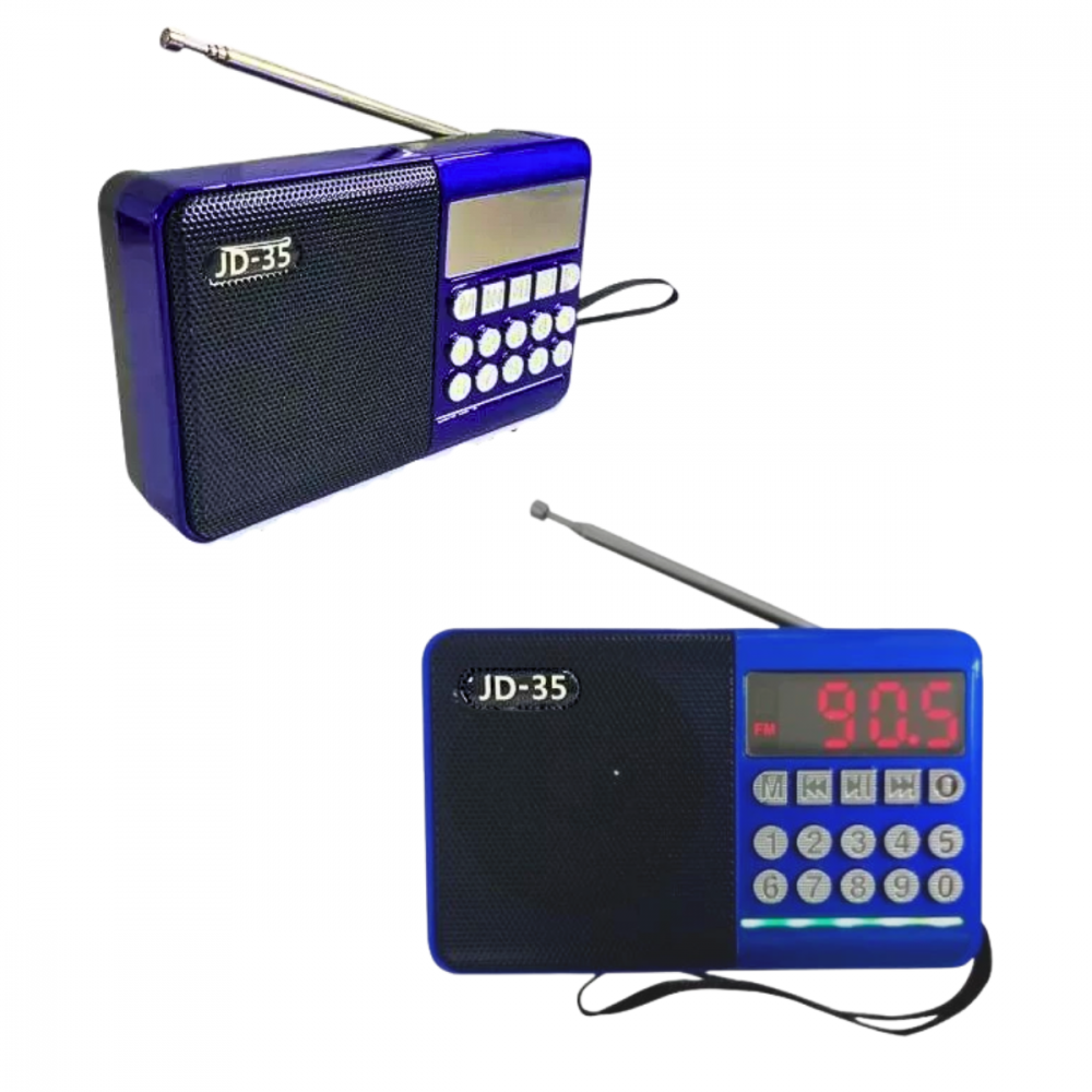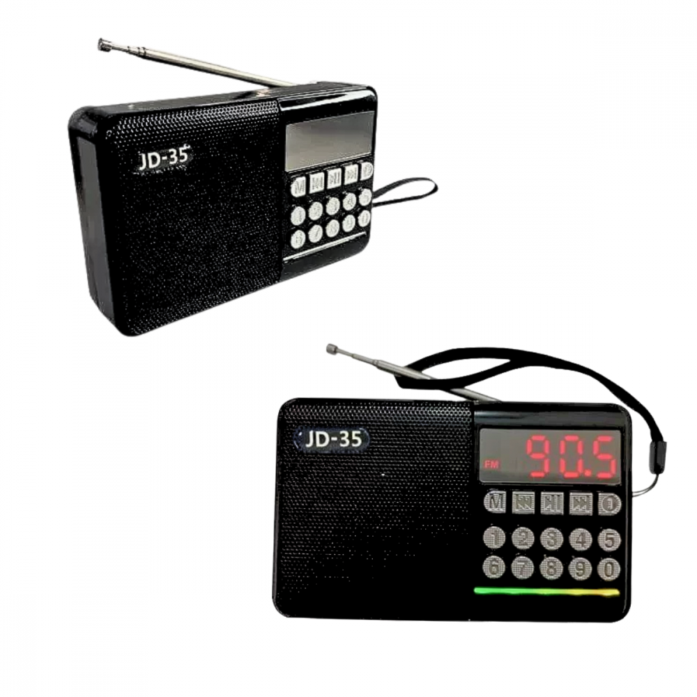 Rádio Portátil JD35 possui painel frontal com botões de comando apara acessar as funções com ótima qualidade de som com conexão USB, bateria recarregável de ótima recepção.