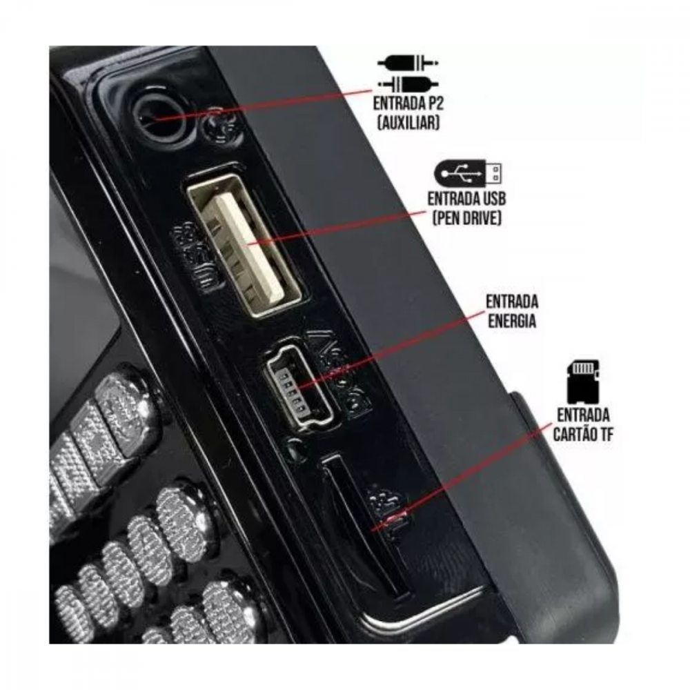 Banda FM, Bluetooth, saída auxiliar para fone de ouvido P2, entradas USB/Micro SD, alimentação através de 1 bateria (inclusa) recarregável por USB (cabo micro-USB acompanha o produto).